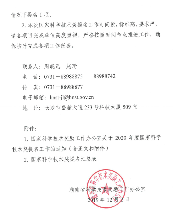 2. 12月19日下午下班前按照《2020年度国家科学技术奖励提名工作手册》中的提名公示内容,将提名公示材料电子版发送至科技处指定邮箱,纸质版交至学校崇德楼1107室,用于省科技厅奖励办进行公示。