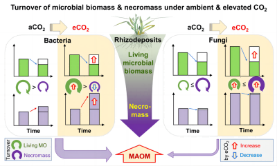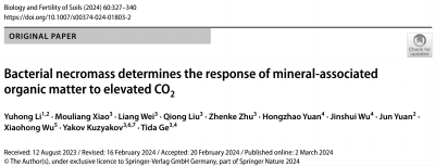 近日,林学院、水土保持学院袁军教授和李宇虹副教授所在团队,与宁波大学植物病毒学研究所葛体达研究员合作,运用13C稳定同位素标记技术,研究了土壤真菌和细菌生物量和残体的周转及其对土壤矿物结合态有机质的贡献,及其对大气CO2浓度倍增的响应。研究成果以“Bacterial necromass determines the response of mineral‑associated organic matter to elevated CO2”为题发表在国际农林科学TOP期刊Biology and Fertility of Soils(https://doi.org/10.1007/s00374-024-01803-2)。研究发现:(1)细菌的生物量周转比其残体周转快,导致细菌残体随时间的积累较快,而真菌残体积累很慢;(2)大气CO2倍增导致了细菌残体的净积累增加,但对真菌残体净积累影响不显著;(3)大气CO2倍增会增加矿物结合态有机质,这种增加主要与细菌残体对大气CO2倍增的响应有关,与真菌无关。