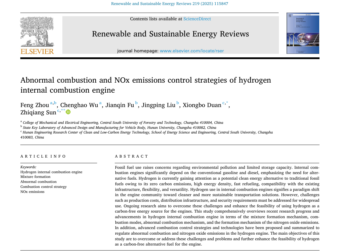 近日我校周峰副教授课题组在能源领域国际Top期刊《Renewable and Sustainable Energy Reviews》(中科院SCI一区,IF=16.3)上发表综述论文“Abnormal combustion and NOx emissions control strategies of hydrogen internal combustion engine”(氢内燃机异常燃烧和氮氧化物排放控制策略)。